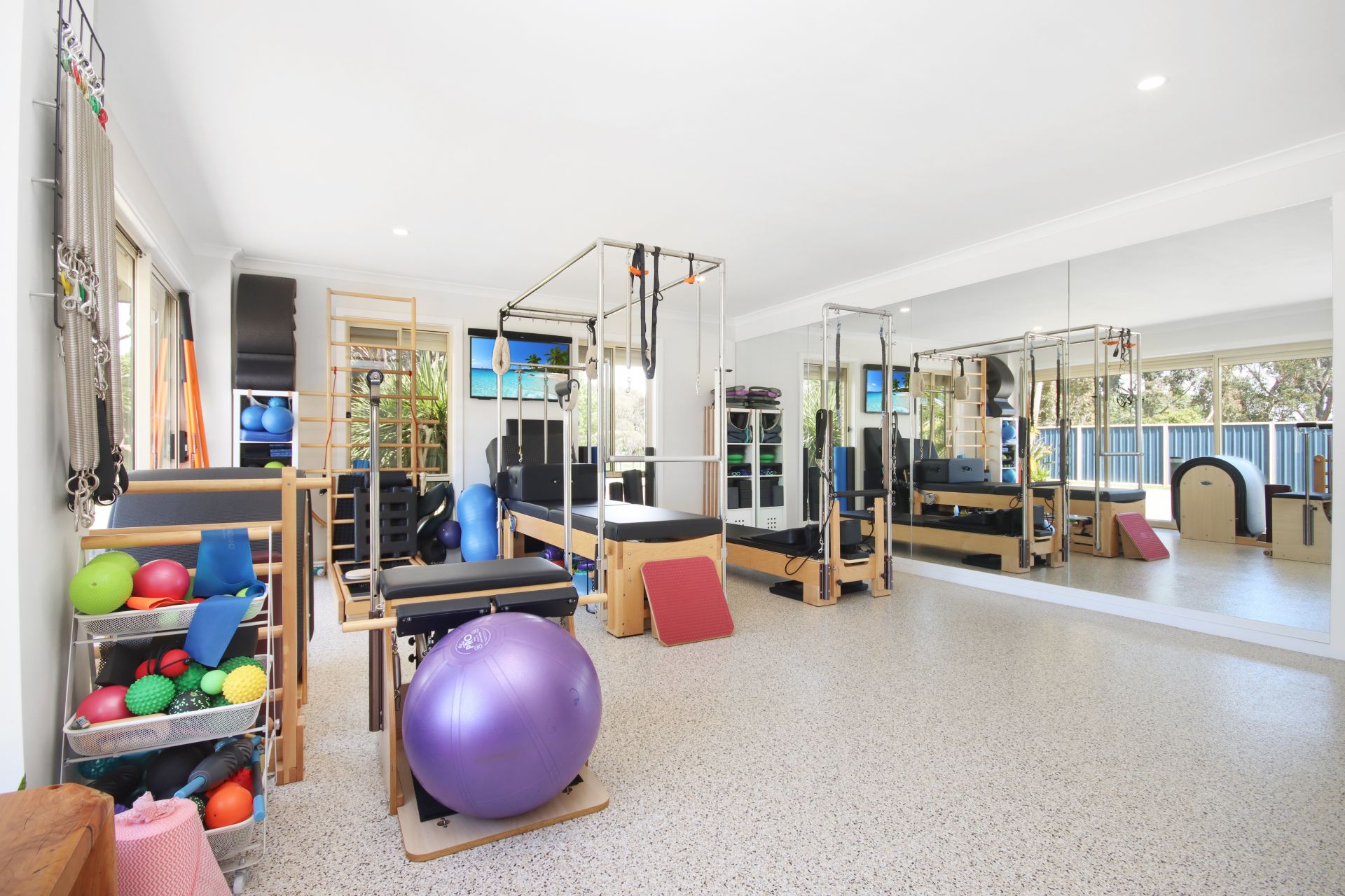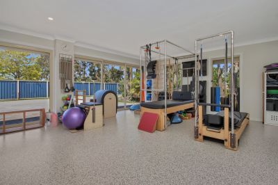 An oversized room currently utilised as a Pilates studio offers versatility – envision a home office, a dynamic rumpus room or additional family space, enhanced by a full wall of mirrors and resilient epoxy floors. Direct entrance from the drive with 2 large sliding glass doors.